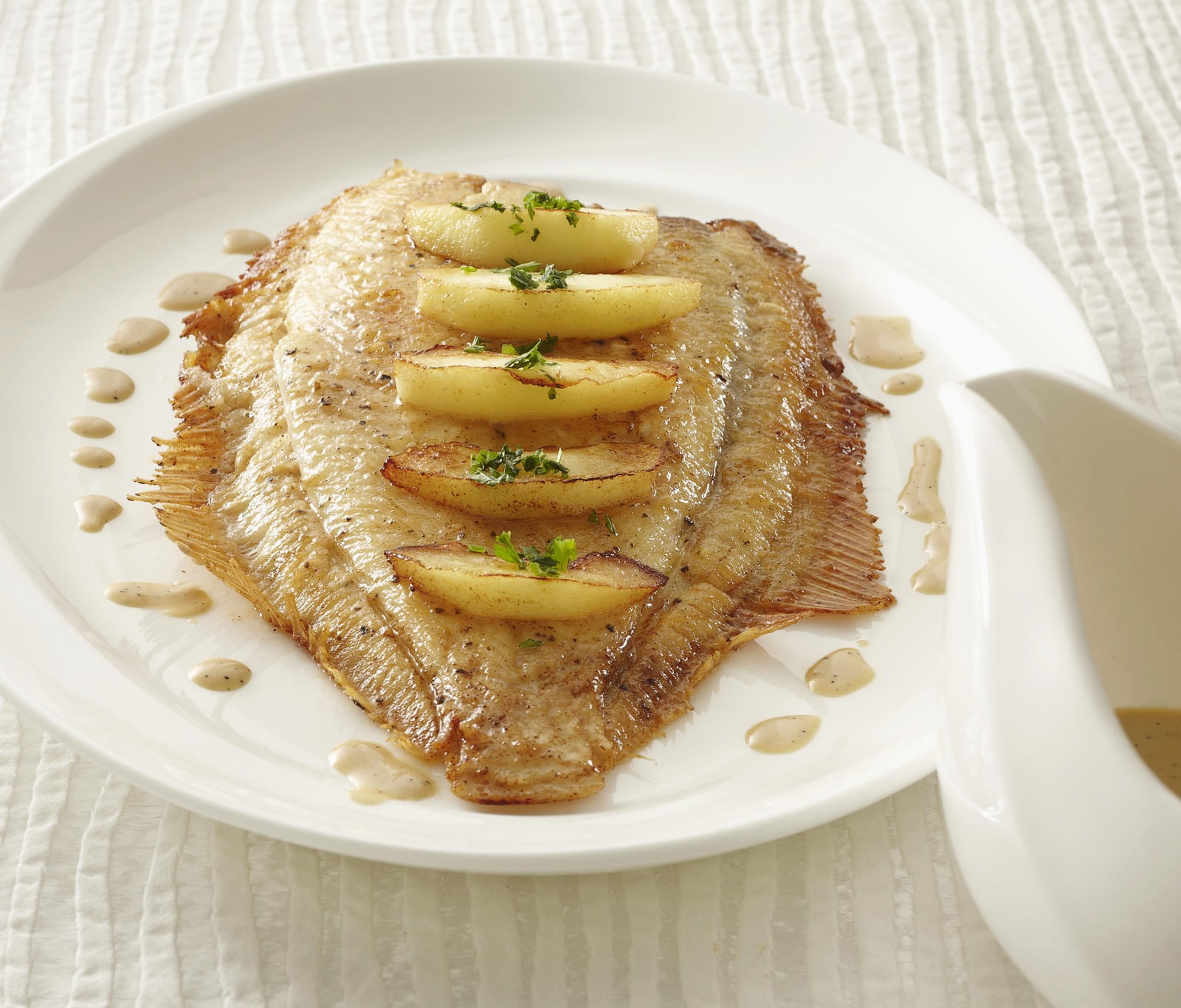 saus op warme borden en leg de tongschar in de saus. Leg de partjes appel dakpansgewijs op de vis. Strooi er wat peterselie over. Serveer de rest van de saus erbij.