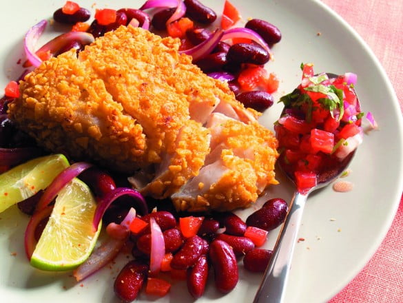 Verhit 3 eetlepels olie in een koekenpan en bak de koolvis op matig hoog vuur in 8 tot 10 minuten knapperig bruin en gaar, keer ze halverwege voorzichtig. Verhit 1 eetlepel olie in een wok en roerbak de ui en paprika 2 tot 3 minuten. Schep de rode bonen erdoor en warm ze al omscheppend nog enkele minuten zachtjes door. Leg de koolvis op vier borden en schep de rode bonen ernaast. Serveer de salsa erbij.
