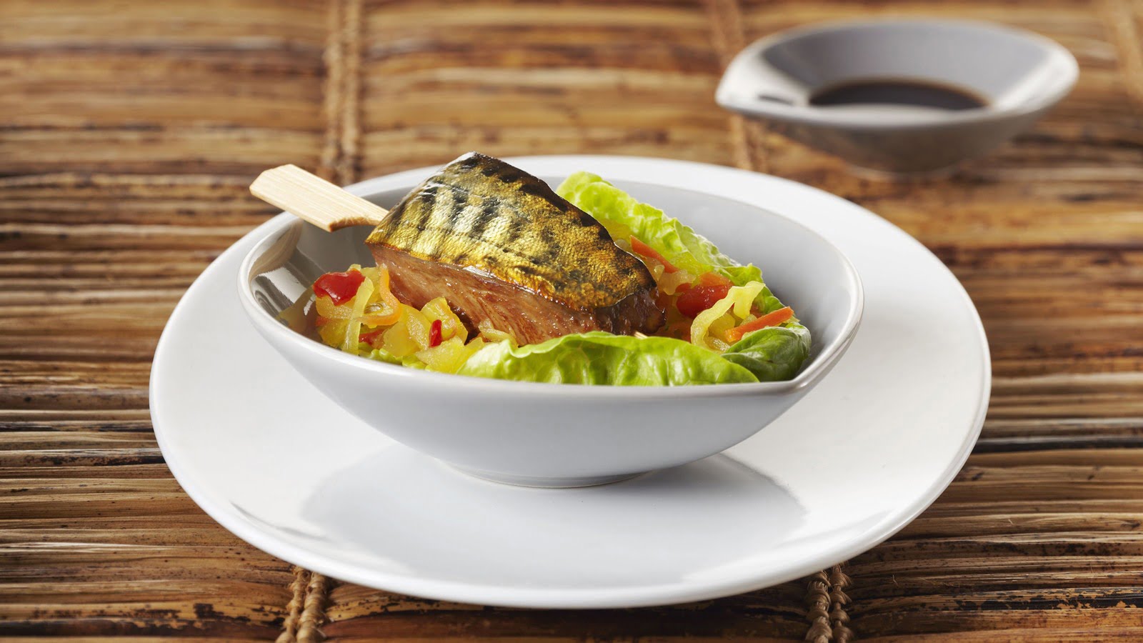 Snijd elke makreelfilet in de lengte doormidden en snijd elk stuk in 2 tot 3 kleinere stukken. Roer in een diep bord de knoflook, gember en sambal met de sojasaus en olie tot een marinade. Schep de makreelstukken erdoor en laat ze 15 minuten marineren. Rijg steeds 1 stuk makreel aan een spiesje.